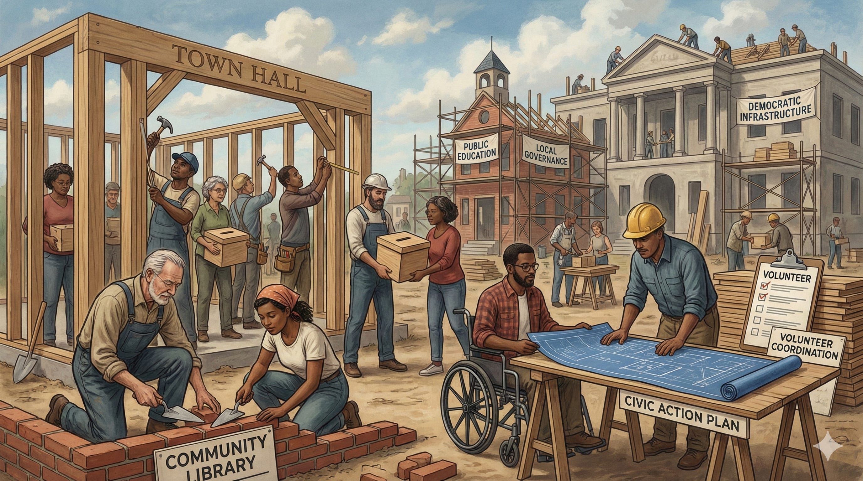 That last part is the whole point. Nobody else is doing it. Nobody is coming. No institution, no leader, no movement is going to arrive fully formed and fix what is broken. The democratic infrastructure of this country was built by ordinary people who decided to build, and it will be rebuilt the same way or it will not be rebuilt at all. That is not a rallying cry. It is a statement of fact. Every generation of Americans that successfully expanded self-governance did so because enough individuals decided to accept the cost of building and got to work. The ones who waited for someone else to do it are not remembered, because nothing happened while they waited.